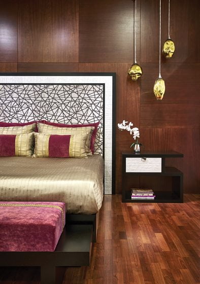 Mother of Pearl Marlene Weiss-Alexander of Weiss Alexander Design Group took inspiration for her bedroom vignette from a mirror she had designed for a client using a mother-of-pearl wall covering by Innovations. The iridescent surface now accents nightstands and a headboard covered in fabric from Great Plains by Holly Hunt. A dresser is made of pau ferro wood with wenge ebony accents and a bench of wenge ebony is upholstered in Romo fabric.