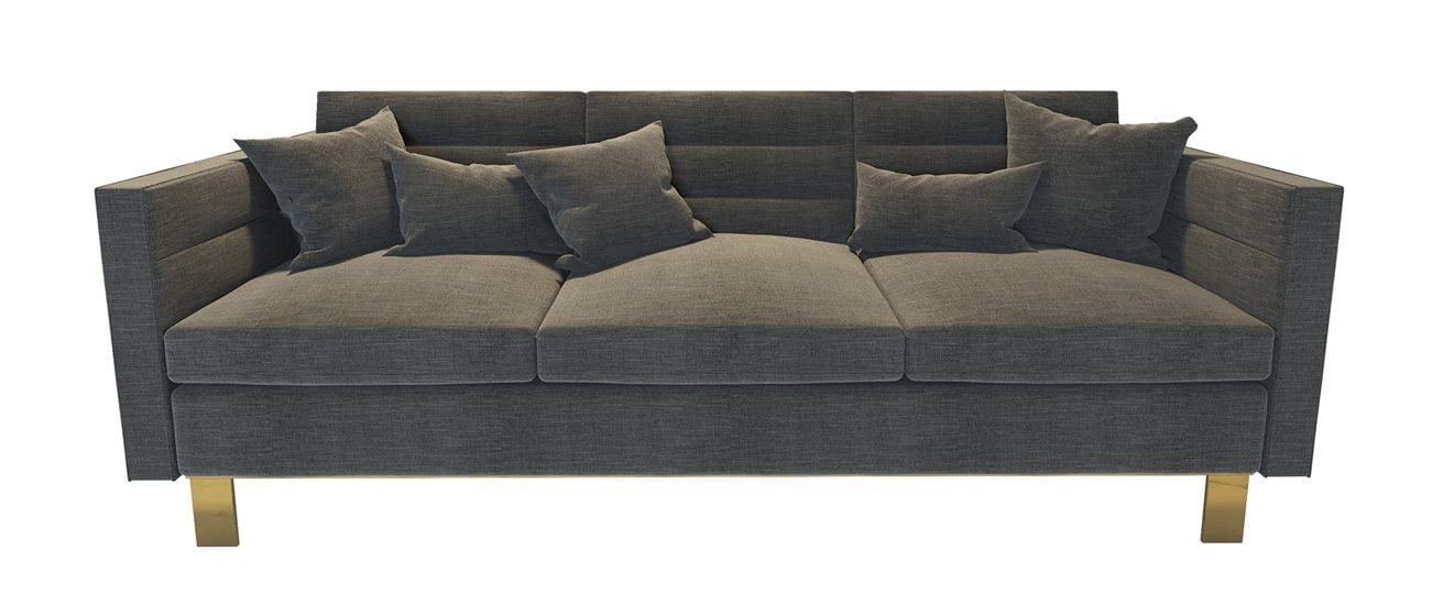 Lisa Bartolomei’s contemporary sofa pairs slender brass legs and velvet upholstery.