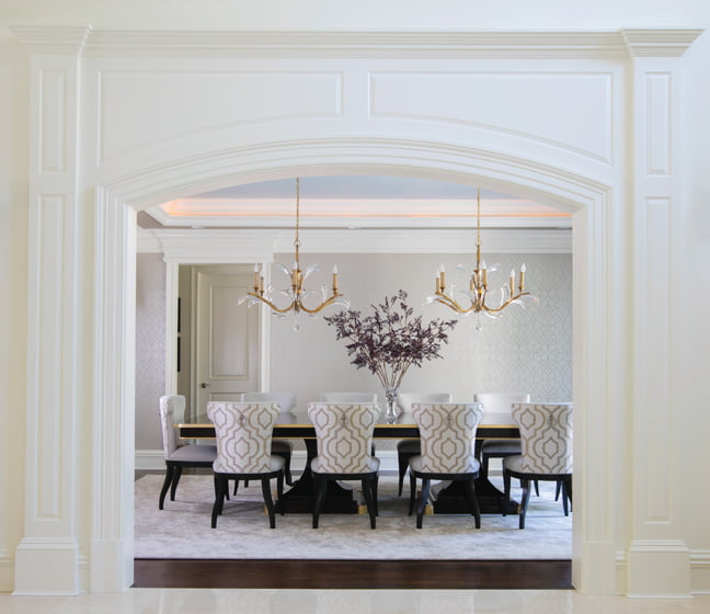 Grace Notes A sophisticated dining room vignette by Paula Grace Halewski of Paula Grace Designs will highlight her Away Dining Table, which will be paired with Ode to Thomas O chairs upholstered in Kravet leather. Halewski also designed the wool-and-silk Link Rug for the collection. Sculpted-glass chandeliers by Fine Art Lamps will be on display.