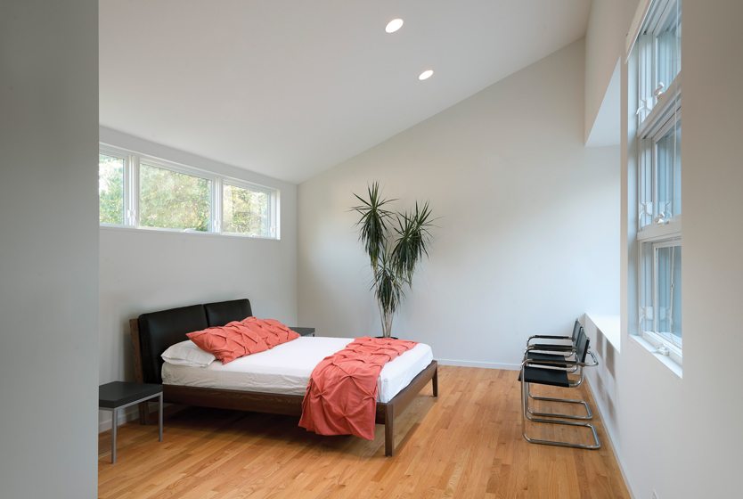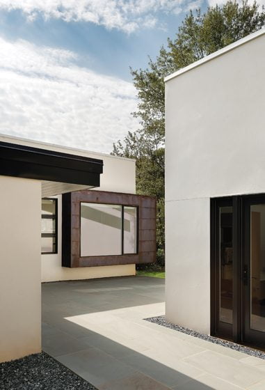 As a designer, Uekman says, “light and clarity are extremely important to me,” so he used glass and white stucco to make the house and garage appear crisply modern. Copper-clad additions housing the kitchen and bedroom bay window provide visual contrast to the pale exterior.