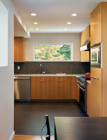 The new kitchen projects from the front corner of the house to offer a large space framed by rift-sawn oak cabinets and Caesarstone countertops. Standing at the sink, Dorough, who picked out the glass-tile backsplash, points to the master bedroom visible through a doorway in the opposite corner. “Even though this is a small house,” she says, “we get long views through the interior so it feels more open.”