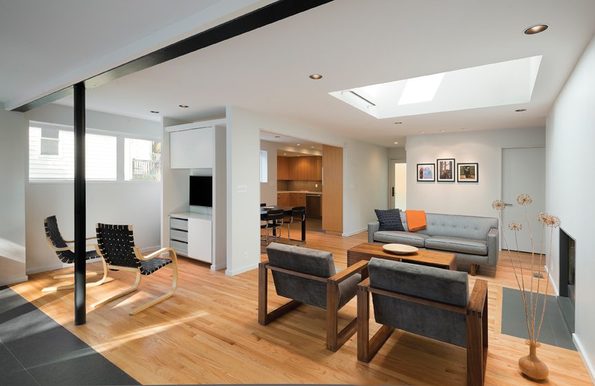 Inside the house, furnishings are kept to a precious few. Authentic Pension chairs designed by Finnish architect Alvar Aalto in the 1930s face the TV. Clean-lined armchairs and a sofa from Room & Board provide living room seating. Uekman designed the walnut coffee table next to the sofa.