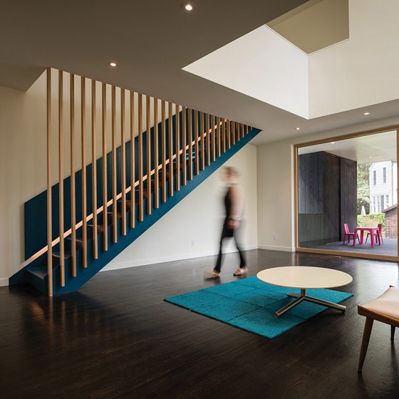 A young family with two small children needed more space but didn’t want their home to feel vast or impersonal. Bucking the trend towards demolishing older, smaller homes in favor of new over-scaled “farmhouses,” they hired EL Studio to expand their one-story bungalow with an appropriately scaled addition. A carport and efficiency apartment on the first floor made way for an addition containing a first-floor playroom and a partial second story with side-by-side kids’ bedrooms with a connecting bath and a new master suite. The playroom accesses the garden through a covered porch tucked under the master suite. South-facing roof apertures capture and direct daylight deep into the north-facing playroom and porch. Expansive windows frame views to the yard.