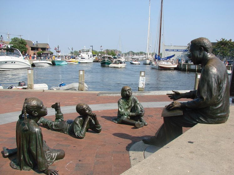 The poignant Kunta Kinte/Alex Haley memorial commemorates the spot wherein 1787, Kunta Kinte and 97 other slaves debarked in Annapolis Harbor from the ship Lord Ligonier. The memorial depicts a life-sized bronze statue of Haley reading to a group of children and points toward the Chesapeake Bay—the road his ancestor traveled to get here. Visitors can also read excerpts from Haley’s influential novel, Roots, and more, on 10 markers along Compromise Street. The site hosts an annual Kunta Kinte Heritage Festival in September with live music, food, and vendors.