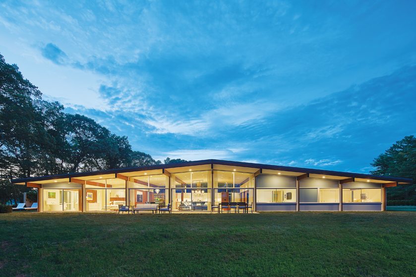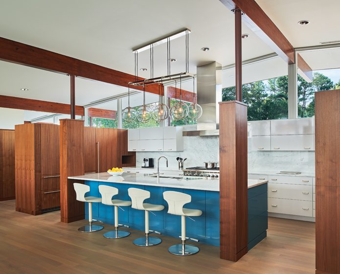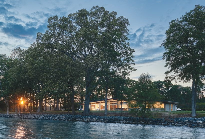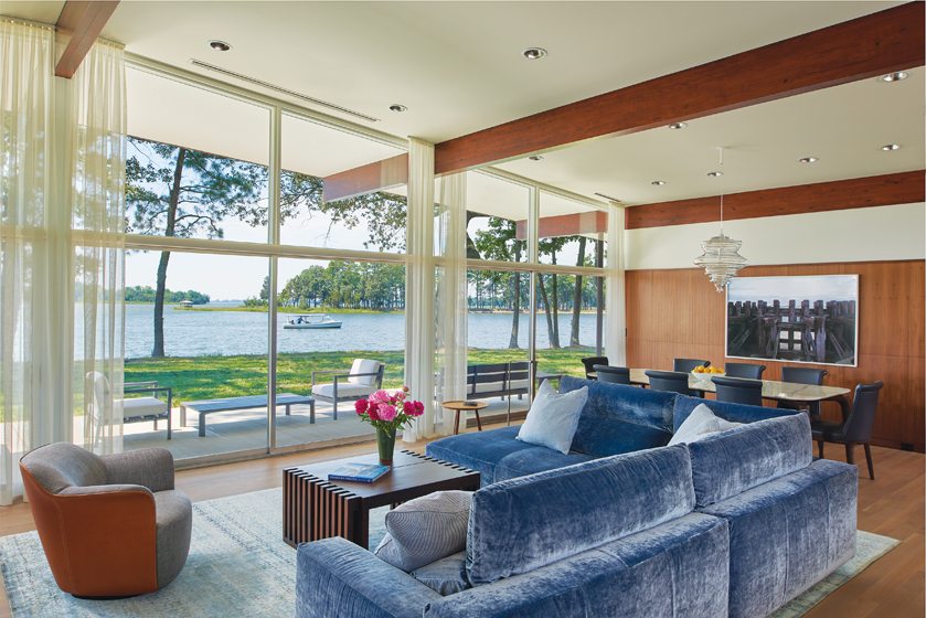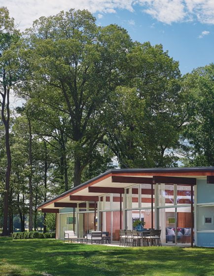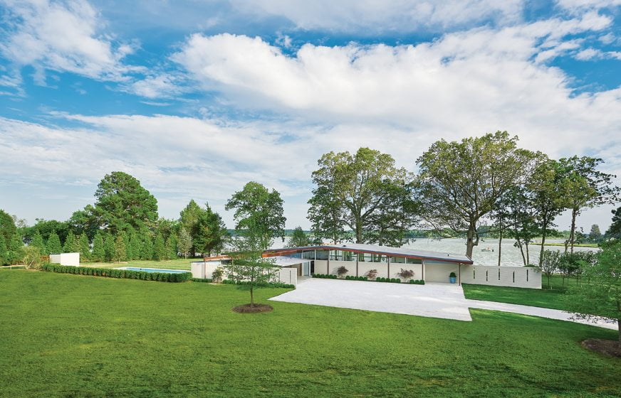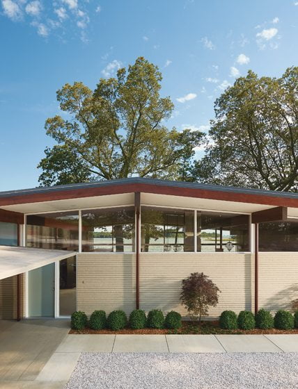 Glass expanses throughout have been replaced with glazed double panes that fit refurbished frames. A poured-concrete patio overlooks the water. The original dingy red brick has been painted light beige, but the home’s exterior is otherwise unaltered. “We tried to change as little as possible outside,” Wiedemann says. “It’s a wonderful example of a Mid-Century Modern home. It was the owner’s vision for it that brought this house back.”