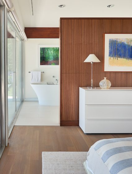 The original abode encompassed a main living area with a bedroom wing on one side and what was probably housekeeper’s quarters on the other. Wiedemann’s team restored the bedroom wing, where three bedrooms boast Frank Lloyd Wright-style built-in bedsteads and storage, all painstakingly duplicated from the millwork original to the house. The housekeeper’s quarters were gutted to create a master bedroom suite, borrowing from the main living area to accommodate a cozy but comfortable bedroom, closet, and spacious master bath.