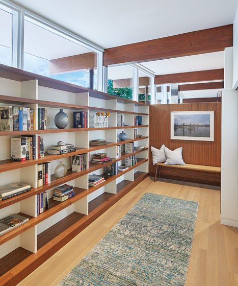 The front door opens to a foyer embellished by a wall of walnut bookshelves; the vertical panels were painted white to blend, emphasizing horizontal lines that echo the linearity of the house. Beyond the paneled floating wall is the kitchen.