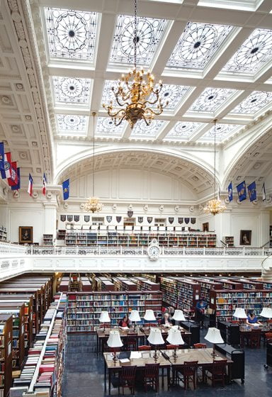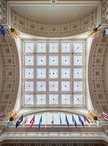 Many DC-area residents will recall DAR Constitution Hall, the site of countless high-school graduation ceremonies. But the Daughters of the American Revolution headquarters on 17th Street actually comprises three landmark buildings. The oldest, Memorial Continental Hall, was designed in the Beaux-Arts Classical Revival style by architect Edward Pearce Casey in 1905. Recently, it underwent a facelift when Quinn Evans Architects restored the vast lay light 50 feet above the DAR Library. Lit from above by a skylight, the leaded-glass structure had sustained cracks, stains and warping over the years. Quinn Evans removed its 25 panels—each measuring eight-by-nine feet—and collaborated with stained- and leaded-glass conservator Femenella & Associates on the job, which entailed preserving 90 percent of the original glass; replicating the slender bars of milled lead, called cames, that hold the decorative glass panes together; and creating stronger structural support. Today, this rejuvenated glass ceiling can be admired in its original splendor above a space full of natural light.