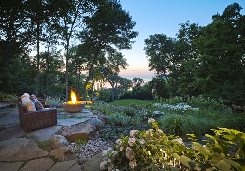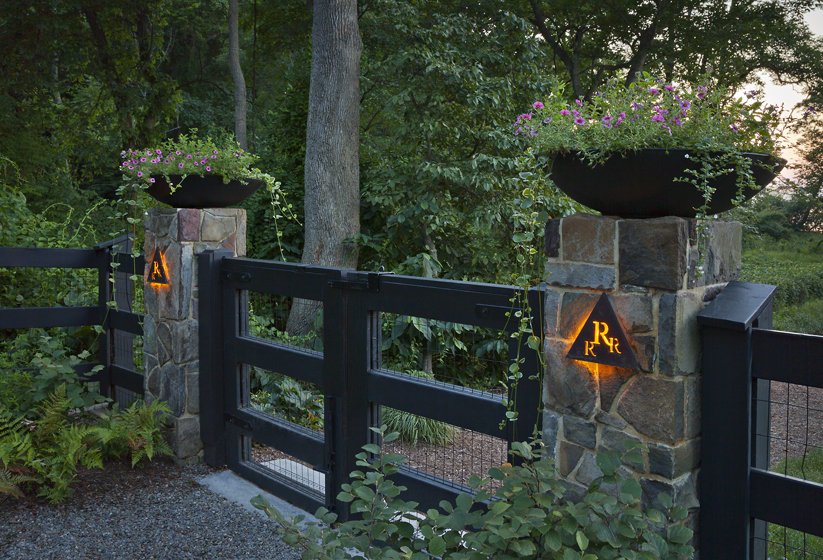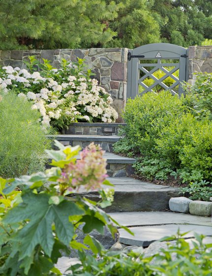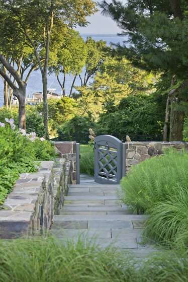 He created a path from the house to the water that originates in neat bluestone steps, then becomes gravel, then dirt, then sand as it reaches its destination. This transition is mirrored in the landscape: Close to the house, rectilinear bluestone patios are framed with hydrangea, while boulders, ferns, and native grasses line the gravel farther away. Gates signal the transitions from formal to informal along the path. “Every landscape should have a gate; it defines the space and creates a sense of surprise,” Barnard notes. “It’s just as important to define spaces outside as it is inside.”