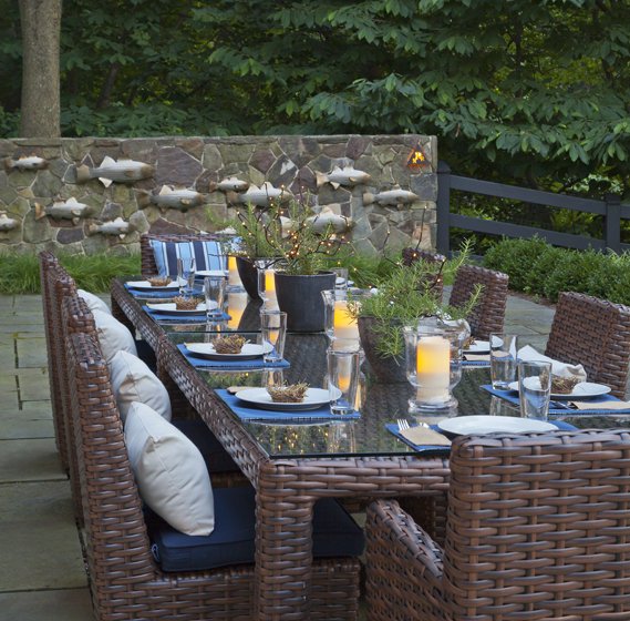 When the couple bought the house, they dubbed it “Red, Right, Return”—the nautical term describing the path a boat must take past red marker buoys when returning to a harbor. A triangular triple-R logo—inspired by a day beacon visible from the property and designed by Barbara Bottinelli—is now a ubiquitous design element, adorning gates, mailbox, outdoor light fixtures, chairs, pillows and more. The logo speaks to the feeling that this is more than a house—it is the place to which its owners love to return.