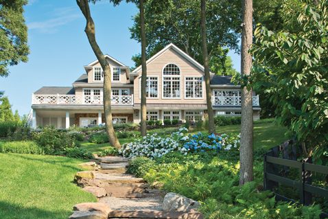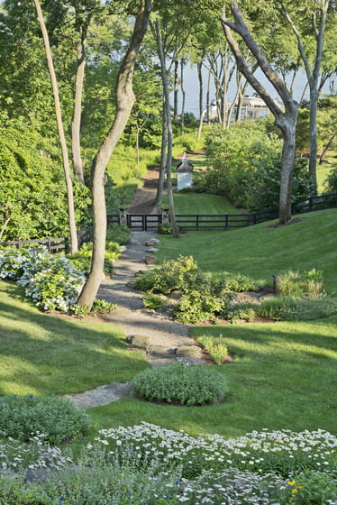 Outside, Miles Barnard strove to ensure that the landscape would look like it had always been there. “This project has such striking views; it’s a big, sweeping landscape dotted with detailed, intimate spaces,” he says. The two-and-a-half-acre property had lovely mature trees but needed better access to the water below, where the Turtles’ power boat and paddle boats are moored. According to Barnard, the slope worked to his advantage. “When you have a property where there’s a long shot down to the water, you have the opportunity to create an experience as you take that walk,” he explains.