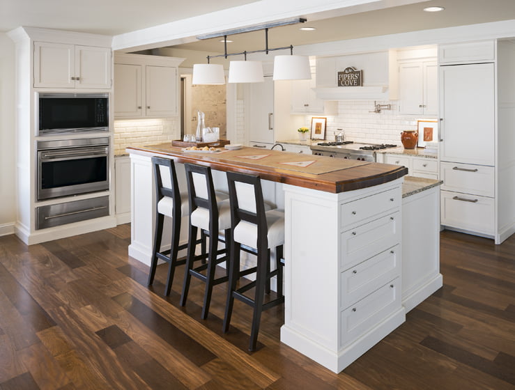 Longo’s redesign encompassed an addition on the front to accommodate a large, welcoming foyer. It also replaced two existing, second-level decks at the back of the house with the remodeled kitchen/dining area. Longo removed a loft and raised the old roofline to create a soaring great room with a two-story wall of bookshelves. New windows and decks take advantage of water views. Light shingles clad the exterior for a timeless Cape Cod feel.