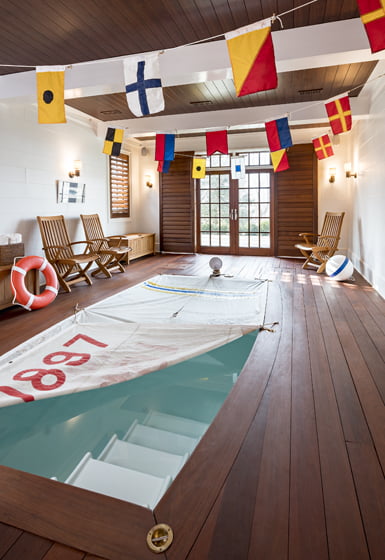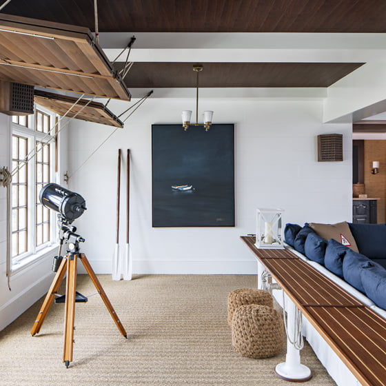 With help from interior designer Barbara Bottinelli, Deborah Tuttle honed in on a sophisticated, livable aesthetic with a judicious use of natural finishes such as the main area’s Bolivian walnut floors. As Longo explains, the house is like “a really elegant old cabin cruiser.” That concept takes a distinctly nautical turn in the basement, which features glossy ipe floors and ceilings and an indoor tension pool shaped like a boat, with a cover made from an old sail and fastened with boat cleats.