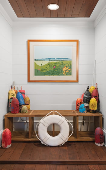 The home is a gallery for the couple’s collections—everything from Inuit sculpture and modern and local art to antique fishing rods and sea glass. “We tried to give the house a patina so it didn’t look too new,” says Tuttle. Furniture from Mitchell Gold + Bob Williams imparts comfortable, transitional style.