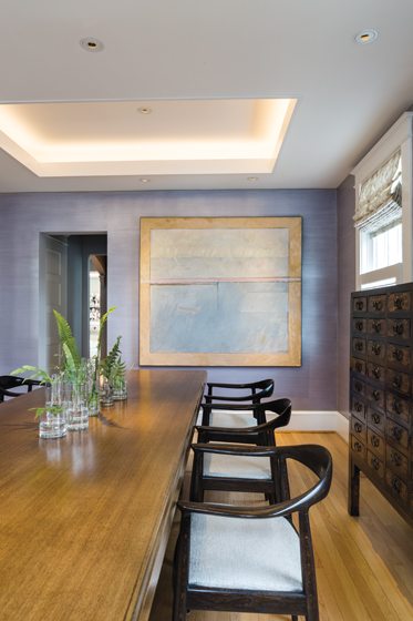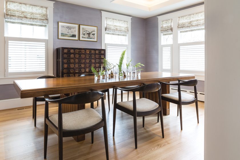 Table, Chairs, Artwork & Asian Cabinet: Clients’ collection. Shade fabric: hollyhunt.com. Trim: and stroheim.com. Dining Chair Upholstery: kerryjoyce.com.
