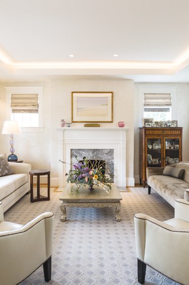 Despite its formality, the home comfortably welcomes frequent visits from family members, including grandchildren. The guest bedrooms and renovated basement feature built-in daybeds. The sunken family room is all about comfort, with a Minotti sectional for TV viewing and a shag rug from Georgetown Carpet.