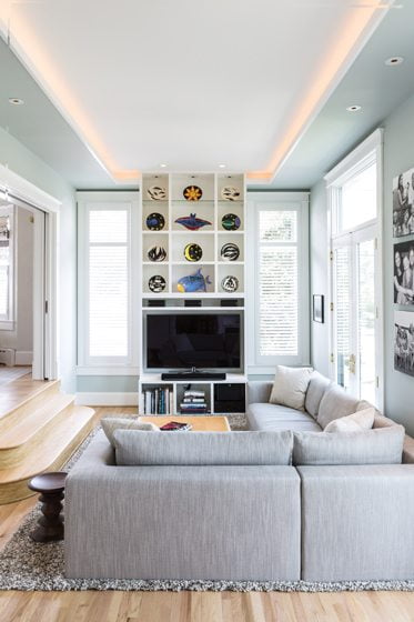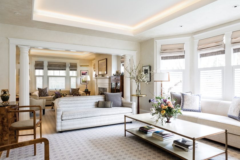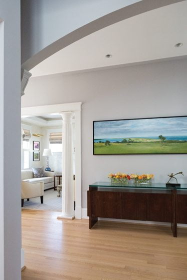For instance, the designer and his team brought cove lighting from the dining room into the living and family rooms and duplicated cabinet-door styles on additional built-ins. They squared off an archway that bisected the living room to match the openings to the entry hall, which are flanked by decorative columns—then added the same columns to the living room.