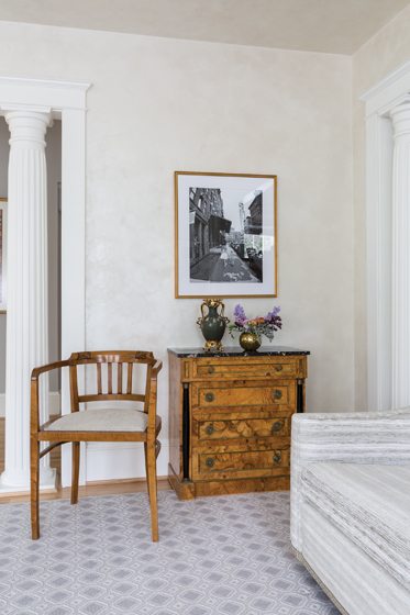 Accent pieces from the online antique resource 1stdibs enhance the classically refined feel. These include Biedermeier occasional tables, Art Nouveau wood-framed chairs, graceful floor and table lamps and an Edwardian-era, glass-fronted cabinet beside the fireplace. A carpet by Stark was customized to fit the irregular space.