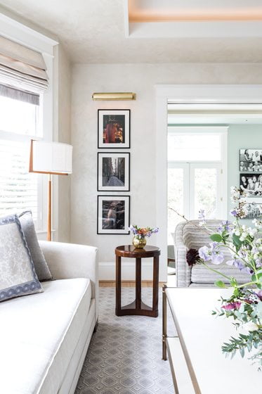 Wall treatment: twindiamonds.com. 1930s Biedermeier Occasional Tables; Danish Modern Floor Lamps; French Blown-Glass 1040s Table Lamps; Edwardian Glass-Fronted Cabinet by Fireplace; Art Nouveau Chairs: 1stdibs.com. Window Shade Fabric: romo.com. Coffee Table by Fireplace & Biedermeier Chests: Clients’ collection. Twin Sofas: hollyhunt.com. Striped Sofa & Armchair: thebrightcompany.uk. Twin Armchairs & Velvet Sofa by Josef Frank: 1stdibs.com. Piping on kidskin chairs: samuelandsons.com. Brass-and-Parchment Coffee Table: Custom design by jdireland.com. Coffee Table Fabrication: woodsandstyle.com. Carpet: stark.com. Frames for Photos: Framesmith DC; 202-518-2500.