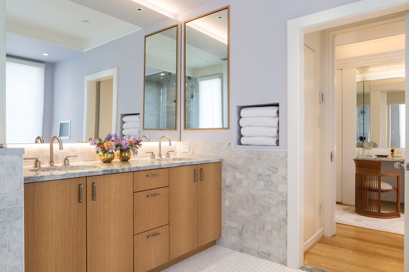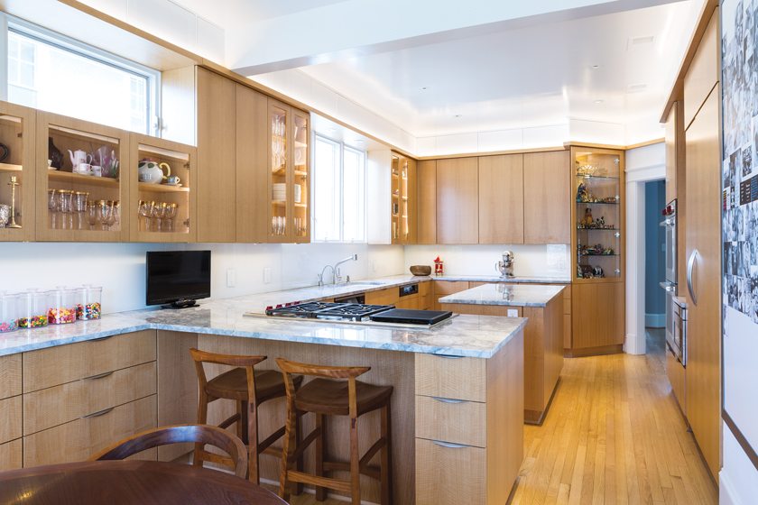 Ireland and his clients also took an editor’s approach to the material palette. The four-and-a-half baths all feature vertical-grain, honey-hued oak cabinetry, White Fantasy marble countertops and white-stone mosaic tile from Architectural Ceramics on the floors and tub and shower surrounds. The same marble also tops the anigré kitchen cabinets and clads the living room fireplace.