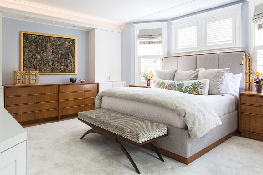 Eucalyptus Bedstead, Nightstands & Dresser, Walnut Bench: Custom design by jdireland.com. Fabricator: woodsandstyle.com. Rug: georgetowncarpet.com. Bed Linens: frette.com.
