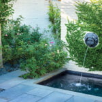 A water feature behind a Falls Church home was conceived by Joseph Richardson of Joseph Richardson Design to buffer noise from neighboring properties in an attractive way. Wheat’s Landscape completed the installation. From a stone pedestal, water spills into a ceramic-tile runnel leading to a stone basin where three scuppers cascade water into a pool below; several valves were needed to control flow. “Many homeowners underestimate the complexity of these structures,” says Richardson. “Larger ones often need chlorination and filtration. Even with the best design and construction teams, water features sometimes take several rounds of adjusting to dial in the perfect flow and sound.”