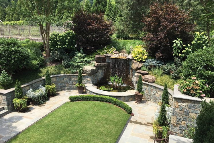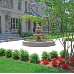 Water features, like this fountain in Leesburg, need to be designed and maintained properly to prevent them from becoming eyesores. Things like head pressure, distance, friction loss, etc., are important factors to consider. Algae control is often overlooked. Even moving water will start to develop forms of algae if proper controls are not designed into the system. —Josh Kane, Kane Landscapes, Inc.