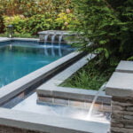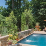 Wall height and flow rate need to be taken into account to create the sound you are looking for. You also want the water feature to be in proportion to the pool and/or property to ensure that it isn’t over- or underwhelming. For this Edgewater, Maryland, project, the clients wanted to hear the soothing sound of flowing water, as well as to buffer the noise of the community traffic. —Jeff Crandell, Scapes, Inc.