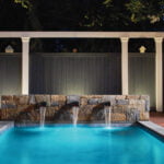 A dramatic focal wall was an important element of Ed Ball Landscape Architecture’s design for an outdoor entertainment space in Aldie, Virginia. Guests in and around the pool can watch TV and movies thanks to a special film installed inside a large, double-pane pool-house window. To create another point of interest, Ball says, “We installed a sheer-descent waterfall that cascades over a flagstone ledge planted with Virginia creeper. This softened the edges of the walls, stucco and stone.” Ball recommends top-notch filtration and cleaning systems for water features. “Make sure you’re spending money on the quality of the materials being used.”