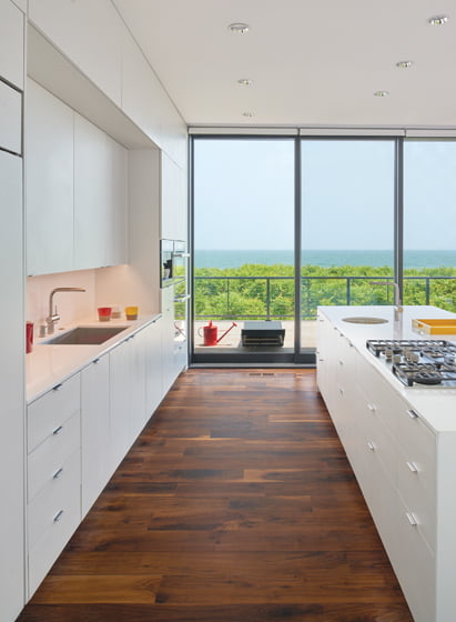 In Gurney’s redesign, a family-room area shares space with the minimalist kitchen (above), which contrasts custom, white-lacquered cabinetry and quartz countertops with rich, walnut floors. The open-plan space flows out through glass panels that slide to one side. Beyond, an ipe deck is bordered by an unobtrusive railing of steel and aircraft cables. “You can see right through the cables to the ocean,” Gurney says. “That was our intention.”