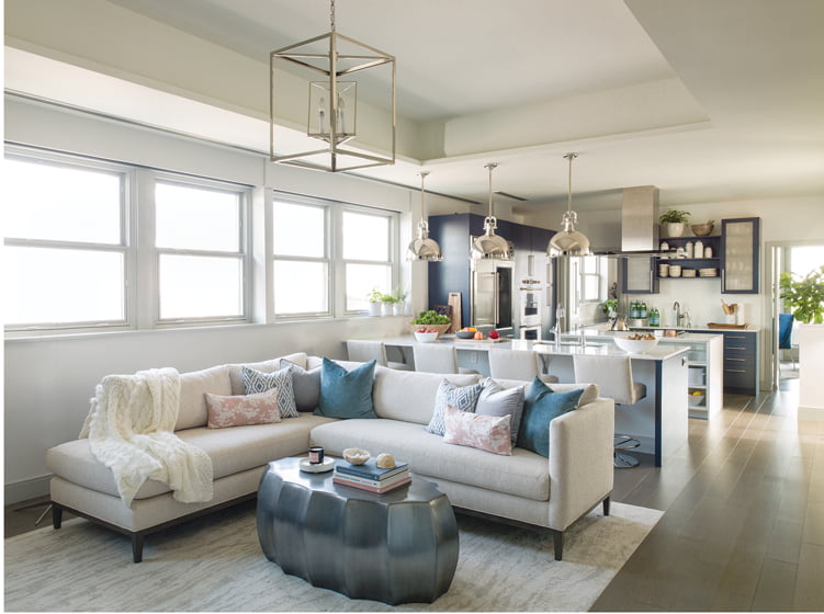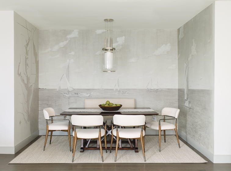Custom molding of Hodges’ design, which she describes as “modern with a reveal,” now runs throughout the condo at ceiling level and on doors, windows and built-ins. To unify the interiors, Hodges devised a color scheme of grays and blues that evolved from her client’s love of the Chesapeake Bay. “The atmospheric colors also serve as a continuation of the Baltimore skyline,” she explains. In the family room, misty grays complement a floor-to-ceiling mural adorning the adjacent breakfast nook that depicts ships under sail in the bay, inspired by her client’s vintage prints by the late Baltimore photographer Aubrey Bodine.