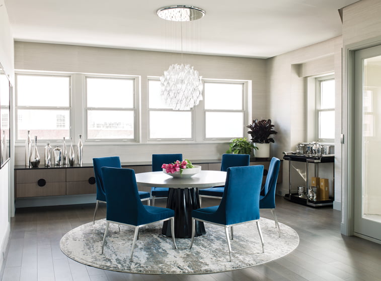 Five years after leaving a career in New York to start her own design firm (and a family) in Baltimore, Laura Hodges got a call from a former Wall Street executive who was also Charm City-bound for family and business reasons. The woman wanted to meet Hodges to discuss the renovation of a penthouse condo she’d bought near the city’s Homewood neighborhood. The 11th-floor aerie with a terrace-balcony overlooking Johns Hopkins University’s undergraduate campus would serve as a home during the client’s frequent visits to attend meetings and host fundraising events. It was also spacious enough to accommodate her Maryland-based parents as well as her husband and sons during breaks from the family’s primary home out West.