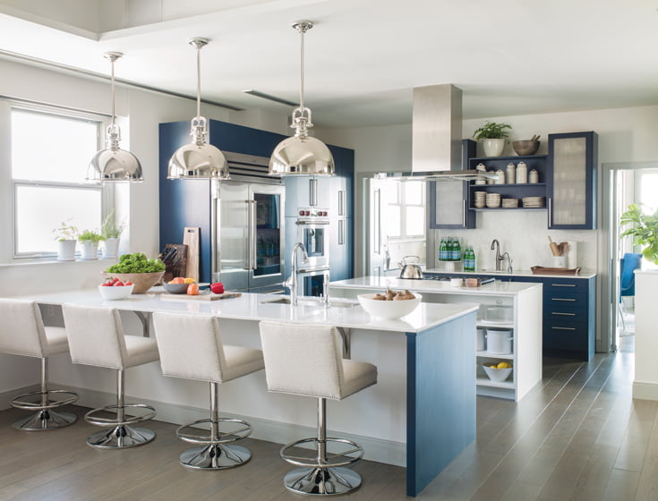 Cabinetry: platowoodwork.com. Bar Stools: vanguardfurniture.com. Refrigerator & Range: subzero-wolf.com. Dishwashers: askona.com. Countertop & Backsplash: silestoneusa.com. Paint Color: Wickham Gray by benjaminmoore.com. Pendants: visualcomfortlightinglights.com.