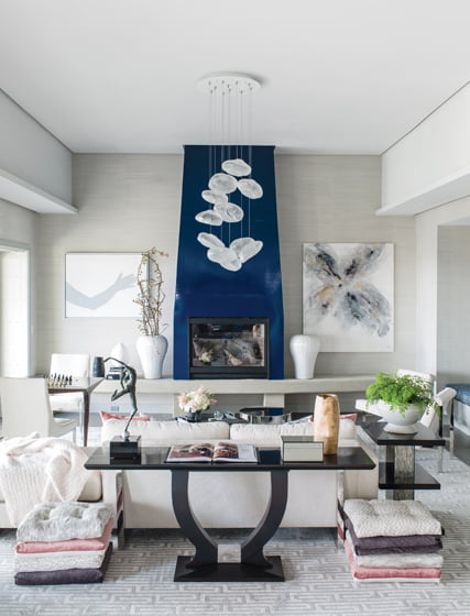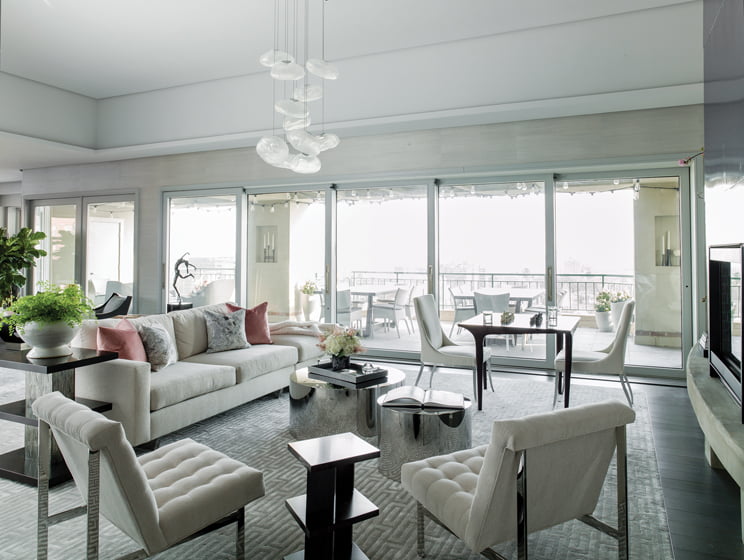 Hodges began the transformation with her client’s desires and lifestyle in mind. Robert Moreland of Lundberg Builders executed renderings for a basic architectural layout. He integrated benches into the entry hall’s load-bearing columns to provide seating with views through the living room to the terrace beyond. Tasked with modernizing and opening what had been a warren of rooms, Lundberg Builders replaced the terrace’s sliding glass doors with five-panel stacking ones to maximize the condo’s capacity for entertaining. Meanwhile, lighting designer Maureen Moran of MCLA simulated a natural wash of light using LED technology, which Hodges subsequently married with stylish fixtures. “The key idea for me was how my client wanted this home to feel,” notes Hodges. “How could I move the design toward calm, elegant and personal and also serve her philanthropic fundraisers?” In recognizing two distinct areas within the U-shaped condo—the front for public entertaining and sides for private family comfort—the designer concentrated on developing elements of style to tie the two together.