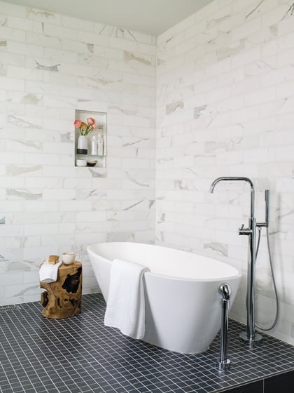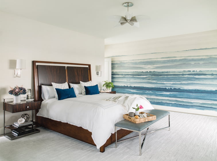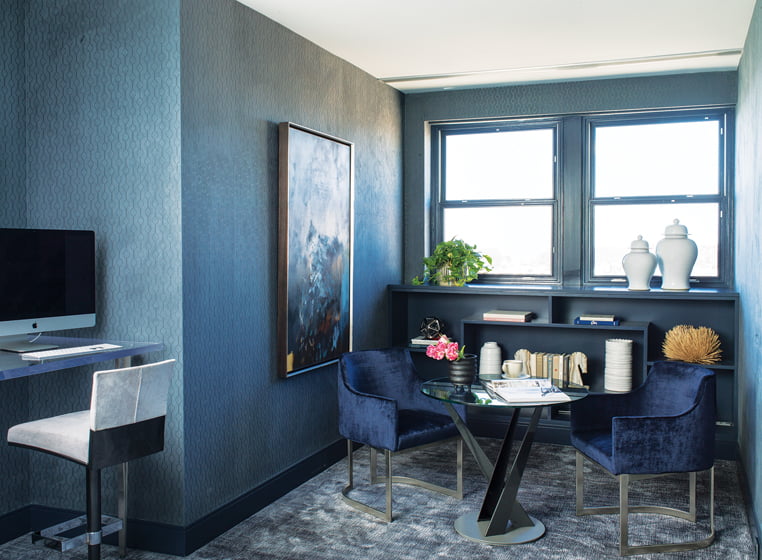 In varying intensities, blues accent every room like stones skipping across placid grays. The hue crescendos in the cocooning, blue-sueded walls of the study. This palette resonated with the homeowner. “The climate and colors of my childhood on Maryland’s Eastern Shore are conjured here,” she observes.