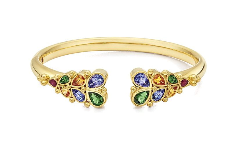 Designed by Temple St. Clair, the Oasis cuff bracelet in 18-carat yellow gold is studded with 5.52 carats of tanzanite, ruby, tourmaline and spessartite garnet. $12,500; tinyjewelbox.com