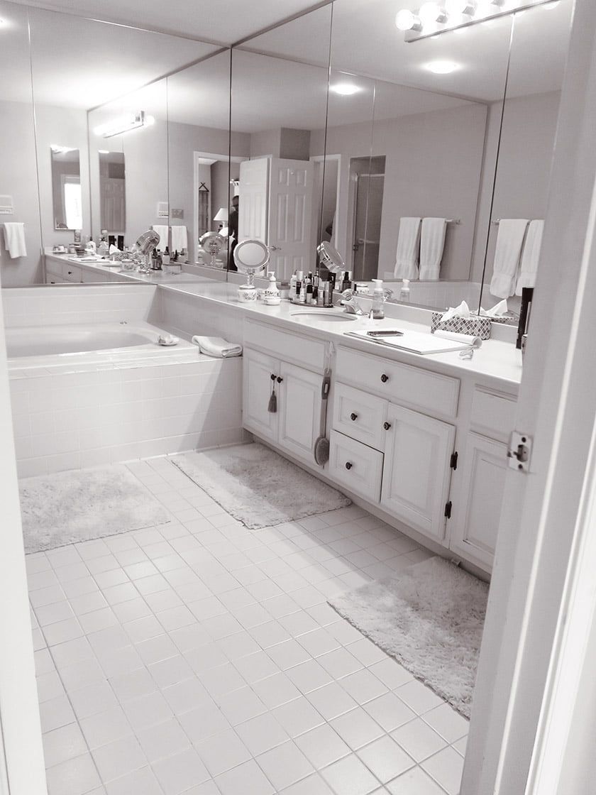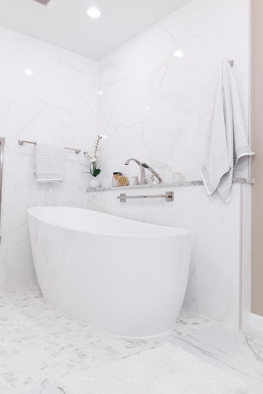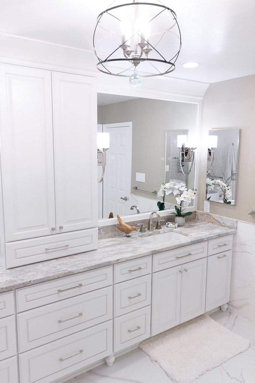 The owners of a Potomac home were tired of their 1990s-era bath. Not only did it have inadequate storage and a tub that took up too much space, but the walled-in shower induced feelings of claustrophobia. Called in to renovate, designers Daniel Carrero and Andrea Pohl reconfigured the layout to make way for an efficient new design and developed an aesthetic that would measure up to the rest of their clients’ elegant home. They carved out room for a large, open shower with a floating bench, a freestanding tub, a separate WC and a 12-foot wall of customized cabinets offering a place for everything from toiletries to a pull-out trash receptacle. The linen cabinet even harbors hidden plugs. Custom-framed mirrors and sconces offer the perfect setup for make-up application. Quartzite countertops and Calacatta tile on the floor and shower walls add a graceful touch. The clients love their new, spa-like escape. Says Carrero, “Even the husband, who was a bit skeptical about the project, is in awe over it.”