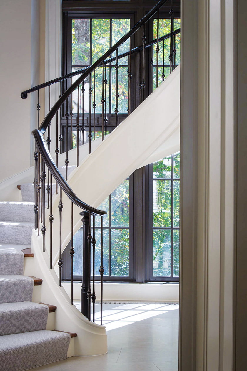 A curved, wrought-iron stair is a focal point at the end of a hallway.