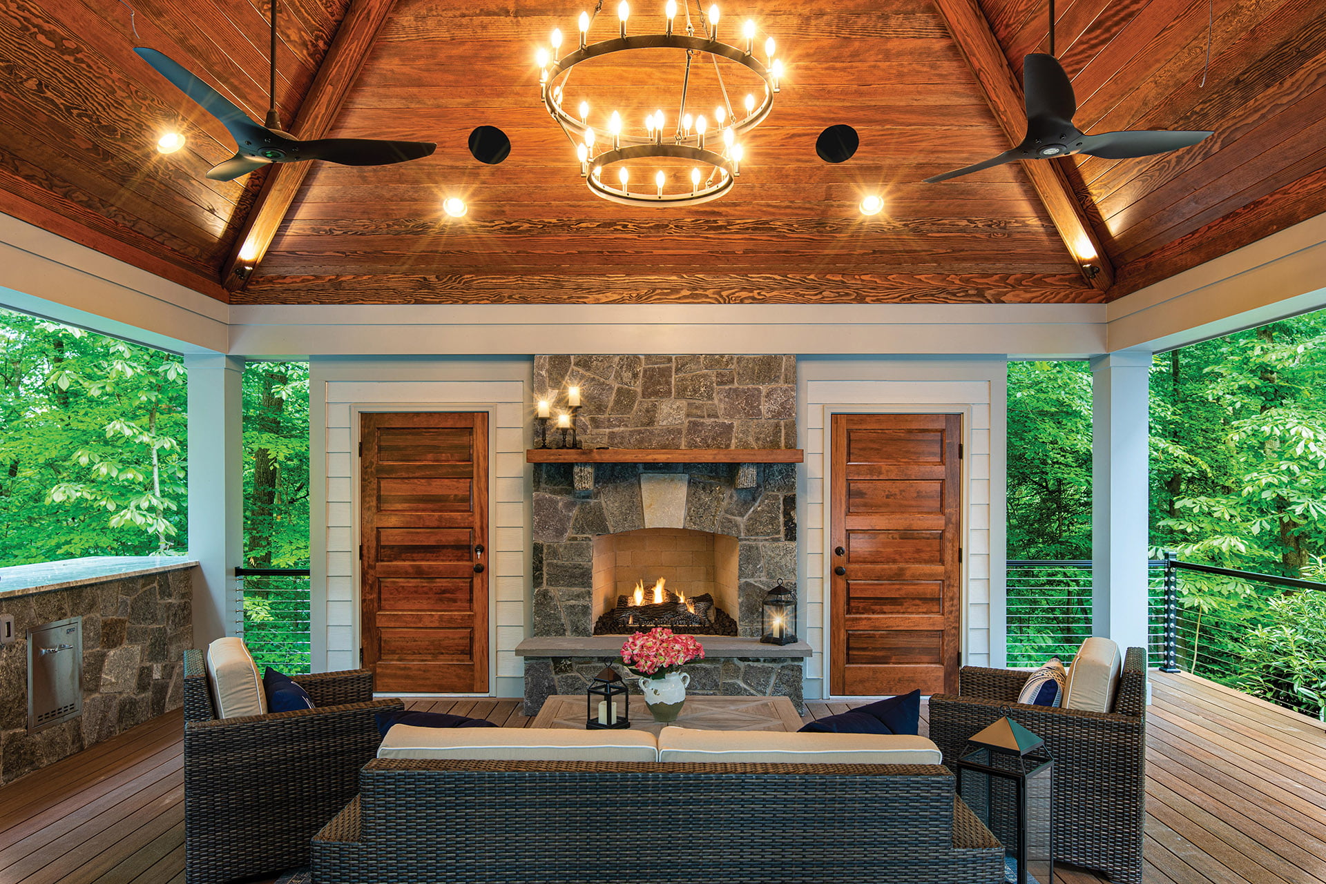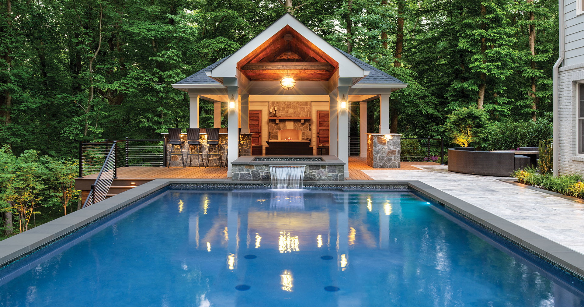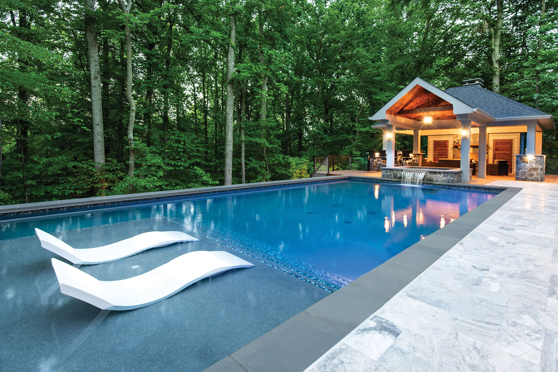 The clients’ vision was a backyard oasis with an “in the trees” appearance, aided by the naturally steep slope of their property. They wanted a complete outdoor living space featuring a full-size pool with an auto cover; a pavilion with a fireplace, storage and a bathroom; a lounging area; and a fire pit.