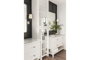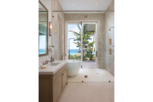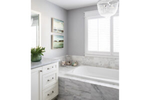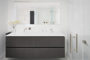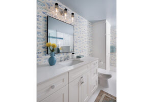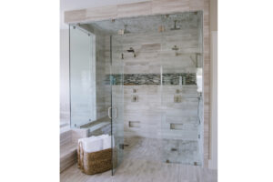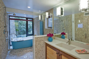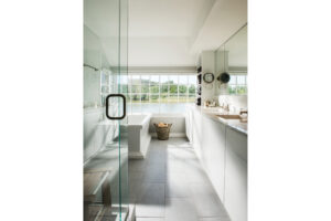 Barbara Hawthorn channeled tranquility in the bathroom of a Potomac, Maryland, cabin via organic materials. “We integrated nature through the use of wood and river rock,” she explains. An undulating quartz countertop and frosted-glass shower enclosure lend a modern touch. PHOTO: KENNETH M. WYNER