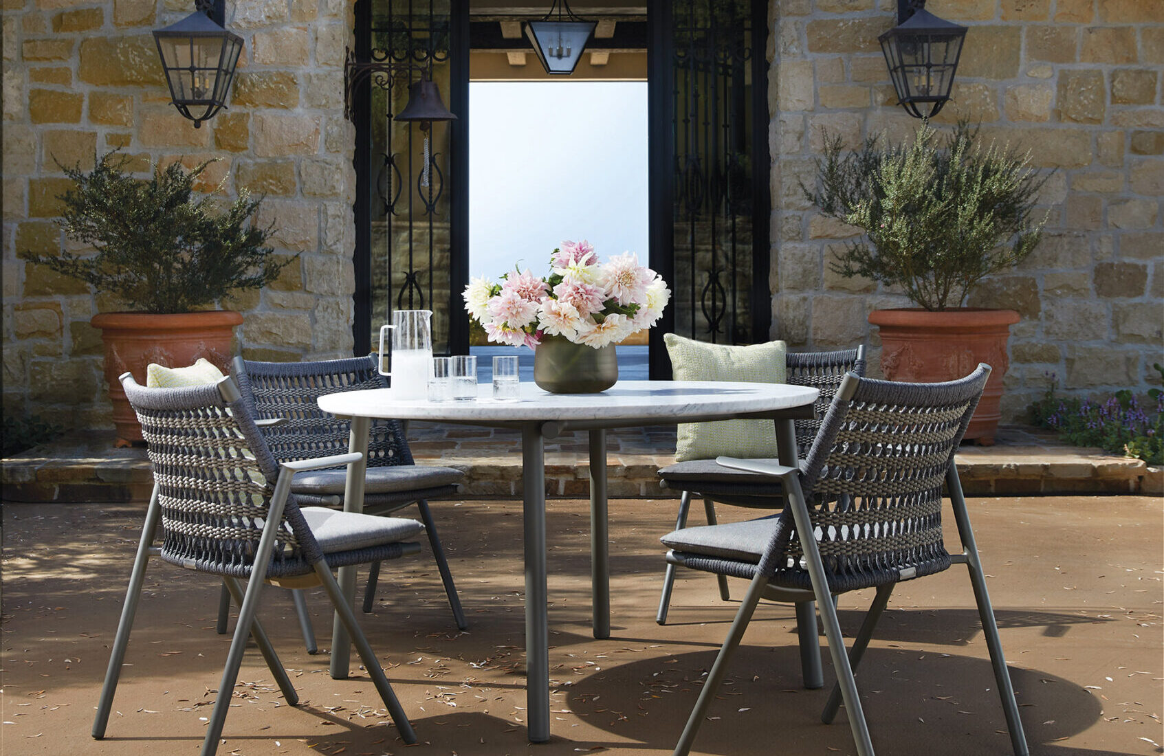 Designer Patricia Urquiola finds the perfect balance between lightness and durability in her Anatra collection for JANUS et Cie. Pictured: The award-winning Anatra Armchairs, with aluminum frames and handwoven rope details, surround the Anatra round dining table, boasting a powder-coated aluminum base and Carrara marble top. janusetcie.com