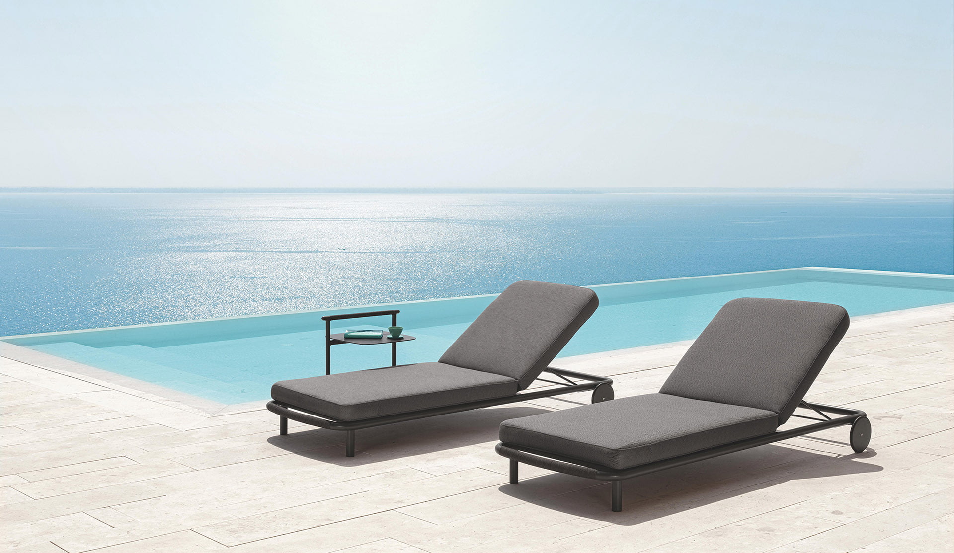 Italian designer Marco Acerbis conceived the Coral collection for Talenti Outdoor Living with an eye toward flexibility and sleek, timeless style. The Coral Sunbed, which pairs an airy aluminum frame with generous cushions, comes in Graphite (pictured) and White. The line also features a modular sofa, armchairs, tables and poufs. talentispa.com