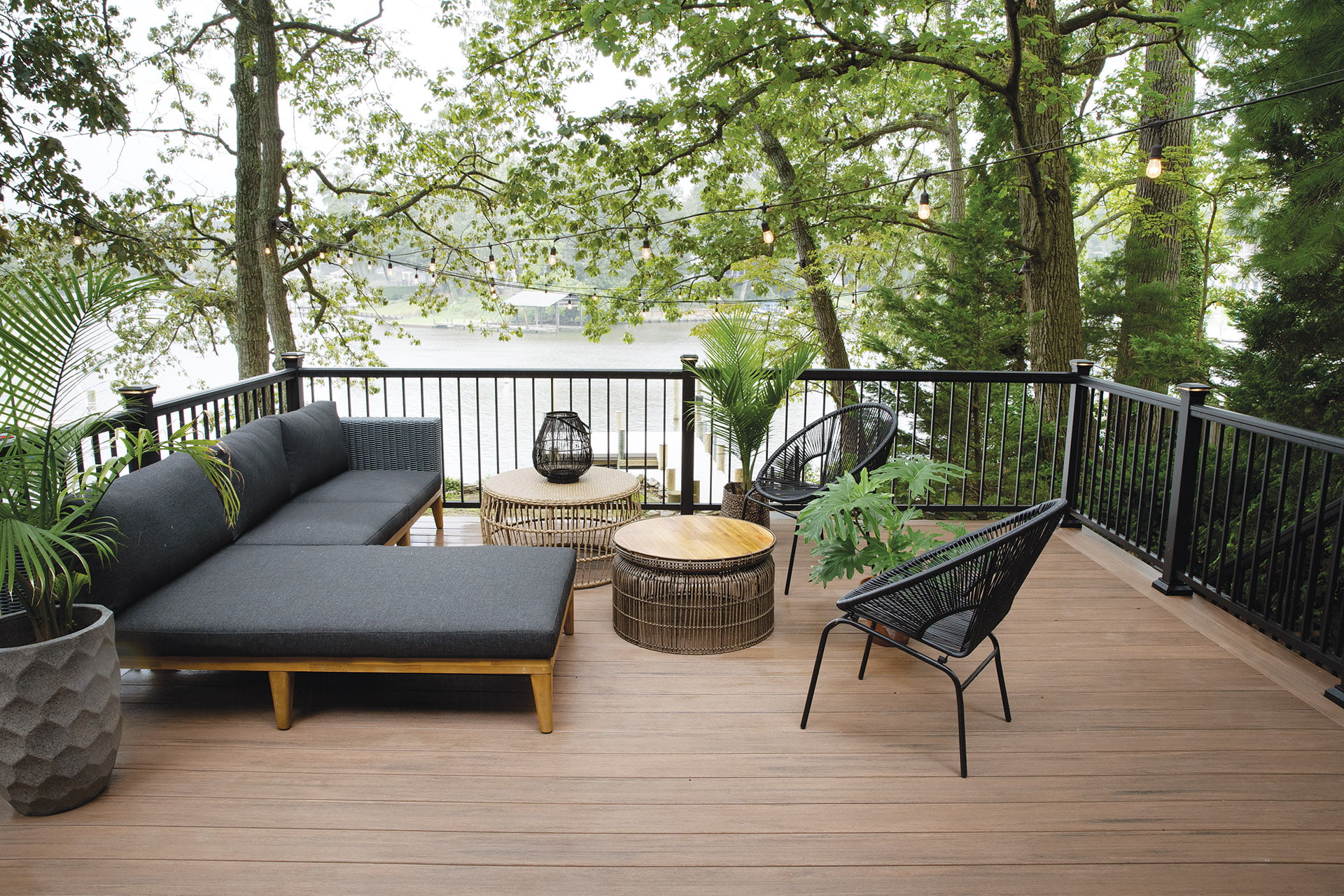 Made largely with recycled materials, low-maintenance TimberTech composite decking mimics the look of natural wood and resists moisture, fading, scratching and staining. The company offers an array of formats and colorways. Pictured: the TimberTech Azek Vintage Collection in English Walnut. timbertech.com