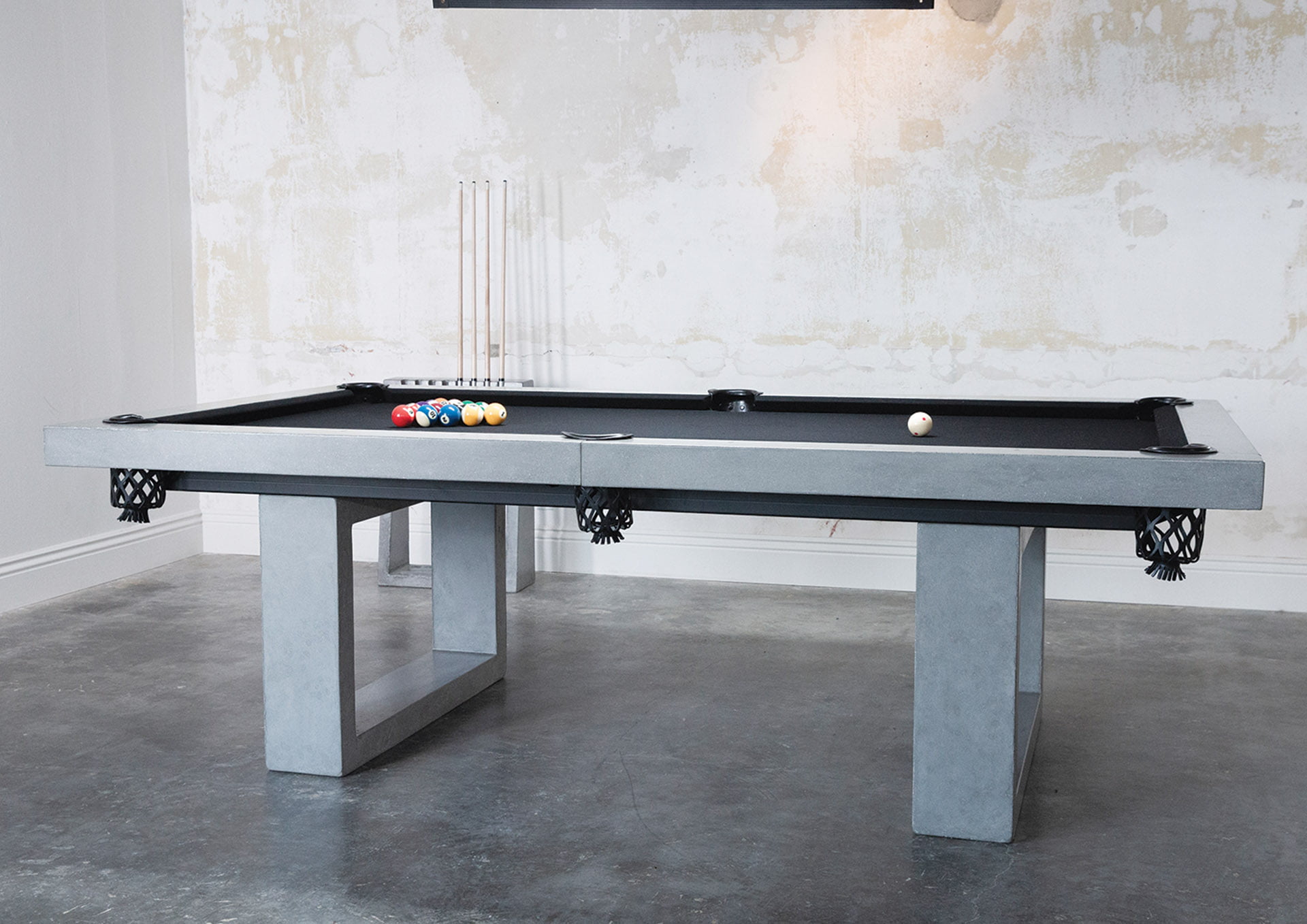 Suitable for outdoor use under cover, this pool table by Los Angeles designer James De Wulf conveys a bold, modern statement. It’s made of concrete reinforced with carbon fiber and features a smooth, high-performance surface layered in premium black felt. Balls and cues are included. jamesdewulf.com