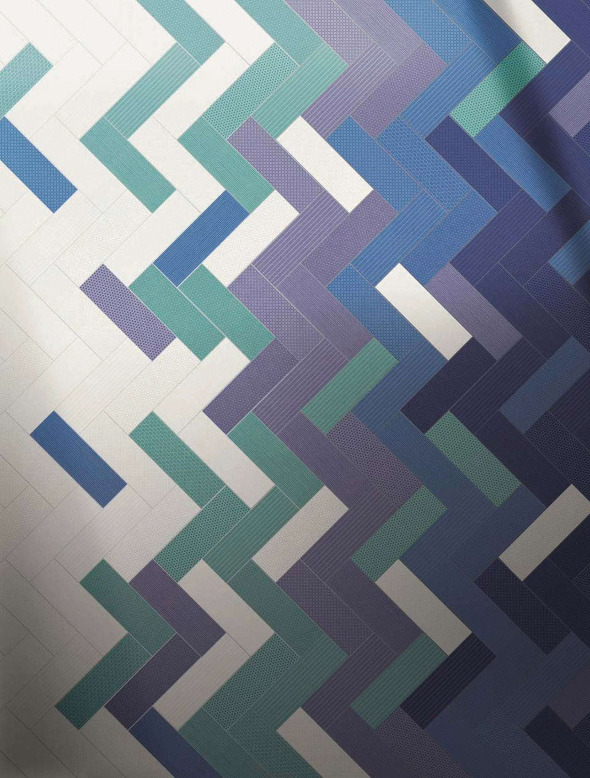 6/ SET IN STONE Fabric-like textural surfaces distinguish Play by Nemo Tile + Stone. The porcelain-tile collection comes in a subway format and in squares combined as a mixed mosaic. Available in a wide range of colors; a herringbone pattern of white, mint, dark blue and purple is pictured. nemotile.com