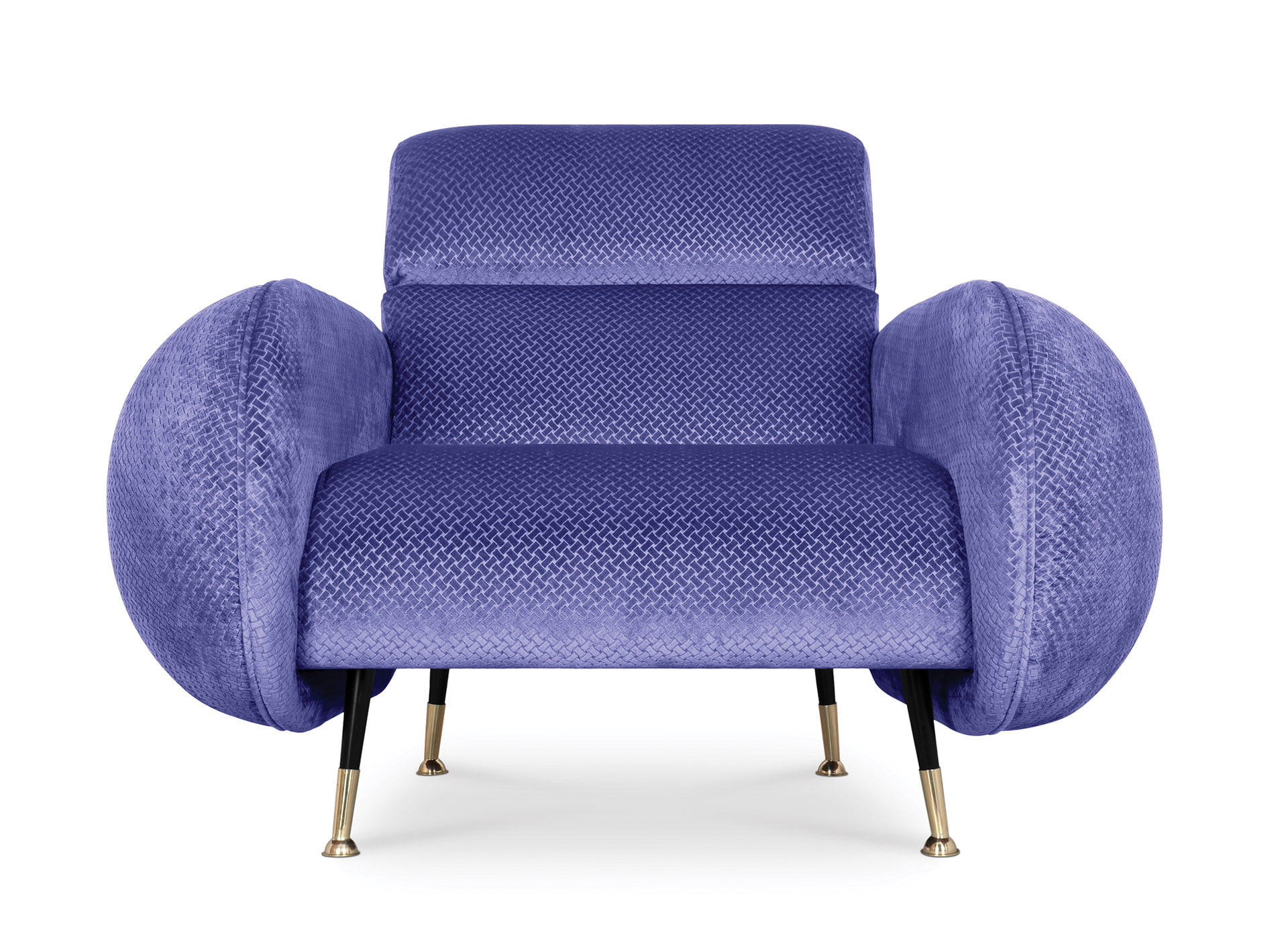3/ RETRO FLAIR The imposing, mid-century-style Marco armchair by Essential Home juxtaposes rounded, oversized arms with delicate polished-brass and glossy-black feet. Clad in Paloma, a textured velvet shown here in Very Peri, it’s also available as a sofa or dining chair. essentialhome.eu