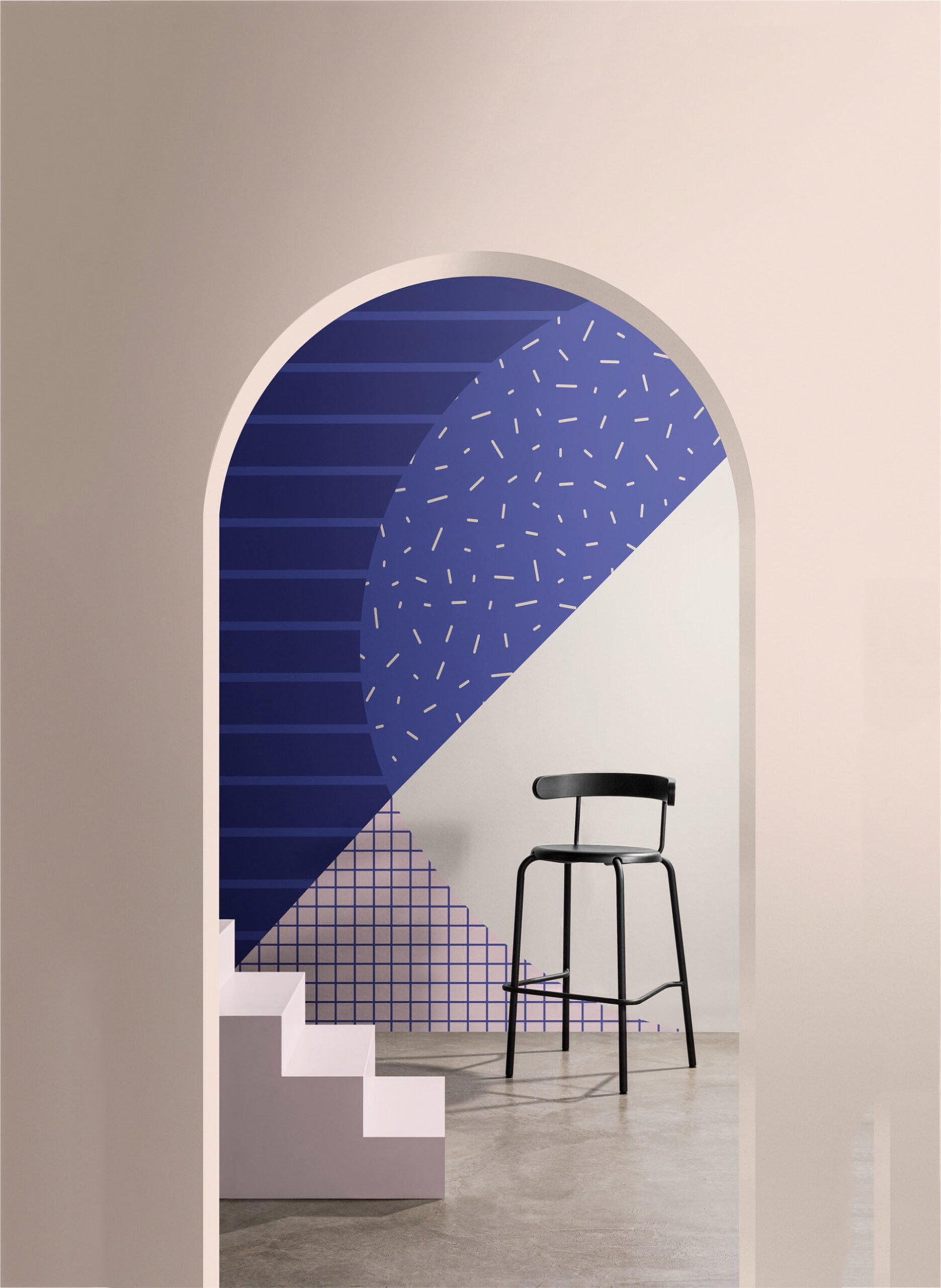 Pantone’s Color of the Year, Very Peri, enhances a crisp, modern space as part of Hovia’s Memphis Blues Blue & Pink Geometric Wallpaper Mural. hovia.com