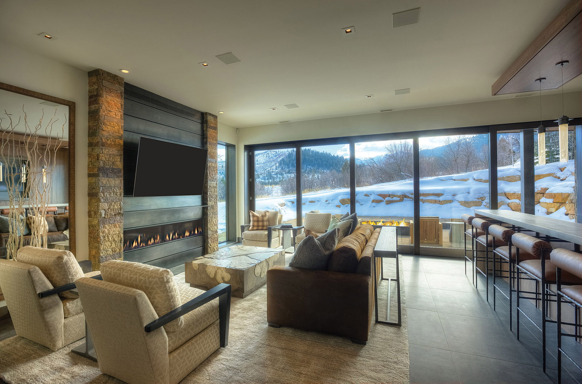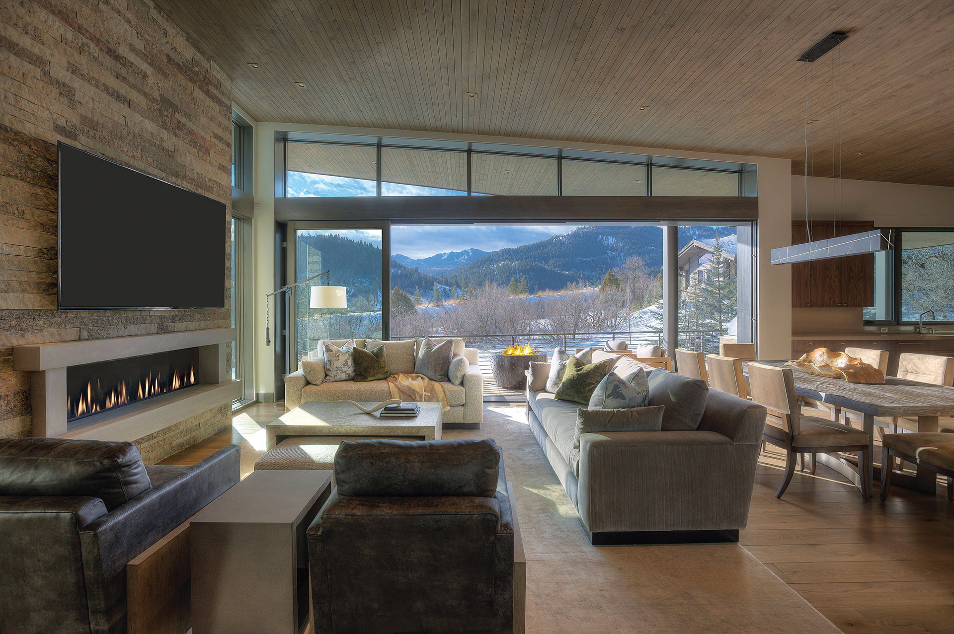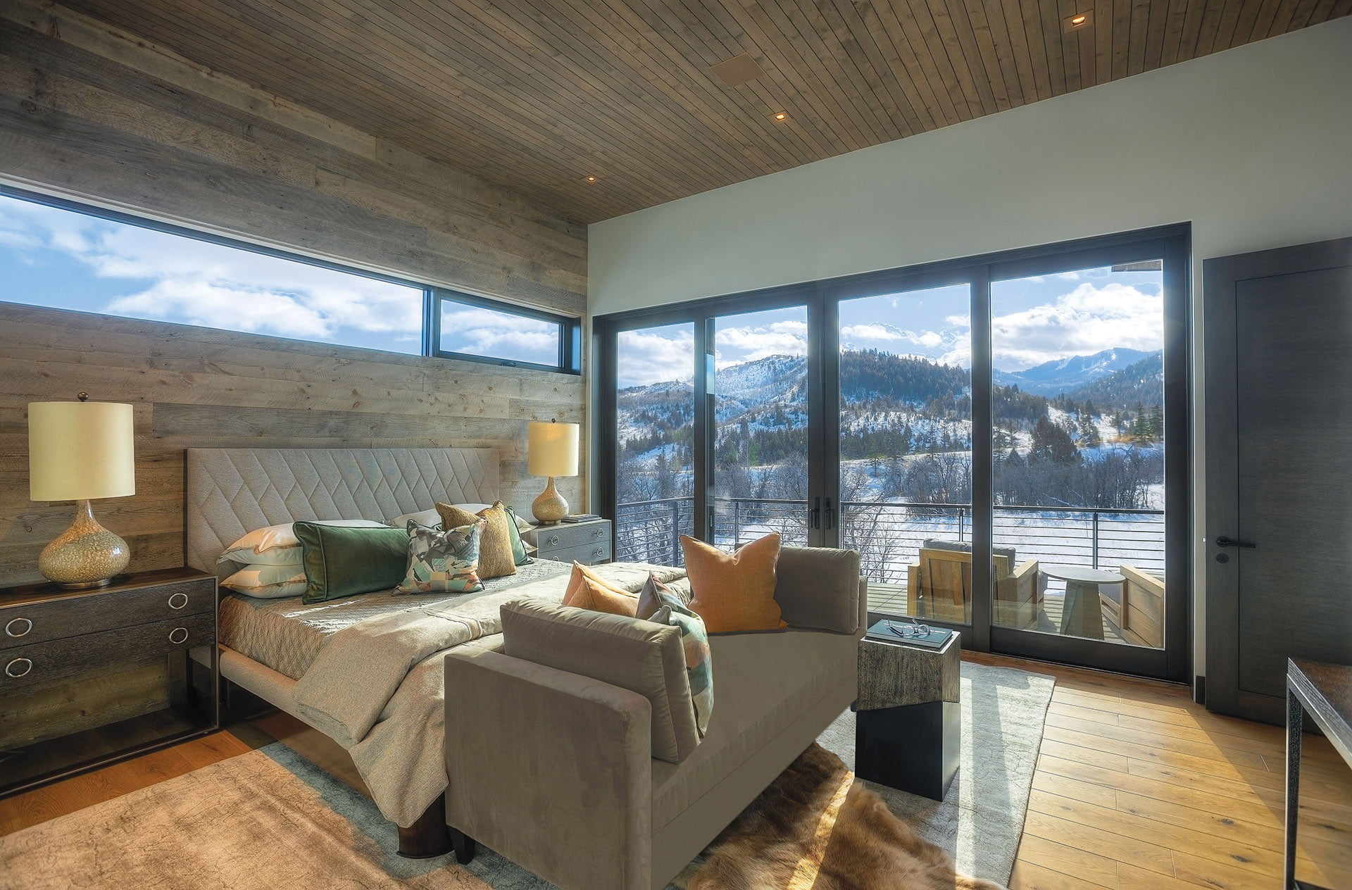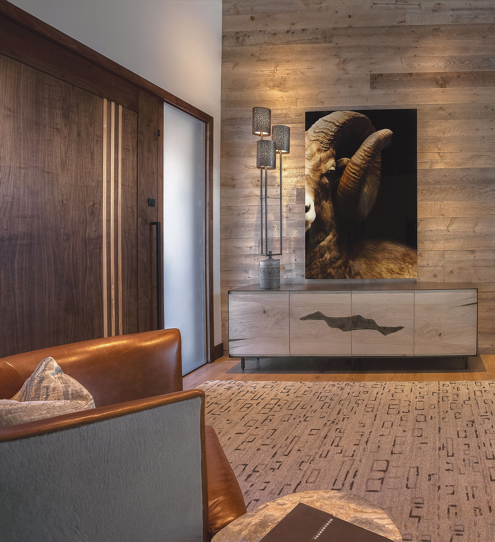 In the foyer, an oversized photograph of a bighorn sheep sets the tone for the project, where over-scaled furnishings and art stand up to the voluminous rooms and heady views. Living areas in the main-level great room and lower-level bar offer plenty of seating for guests. The designers sought textiles “with a lot of depth,” says Critzos, “from mohair and high-quality chenille to leather that is cowboy-esque.”