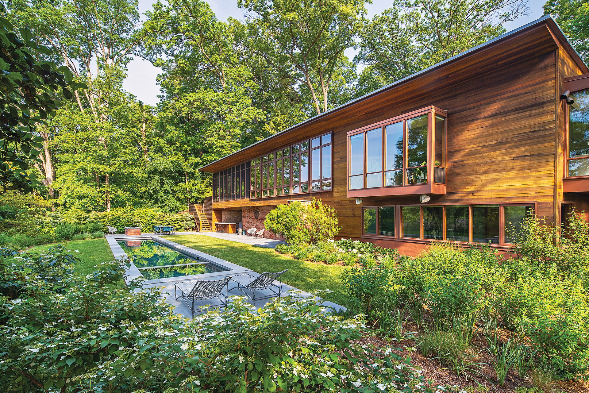 The residence was originally designed by architect Charles Goodman, known for his iconic modern enclaves in the DC area; the home’s first owner was the late CBS commentator Eric Sevareid. The current owner tapped architect Michael Cook to update the structure and Horn to redesign the landscape.