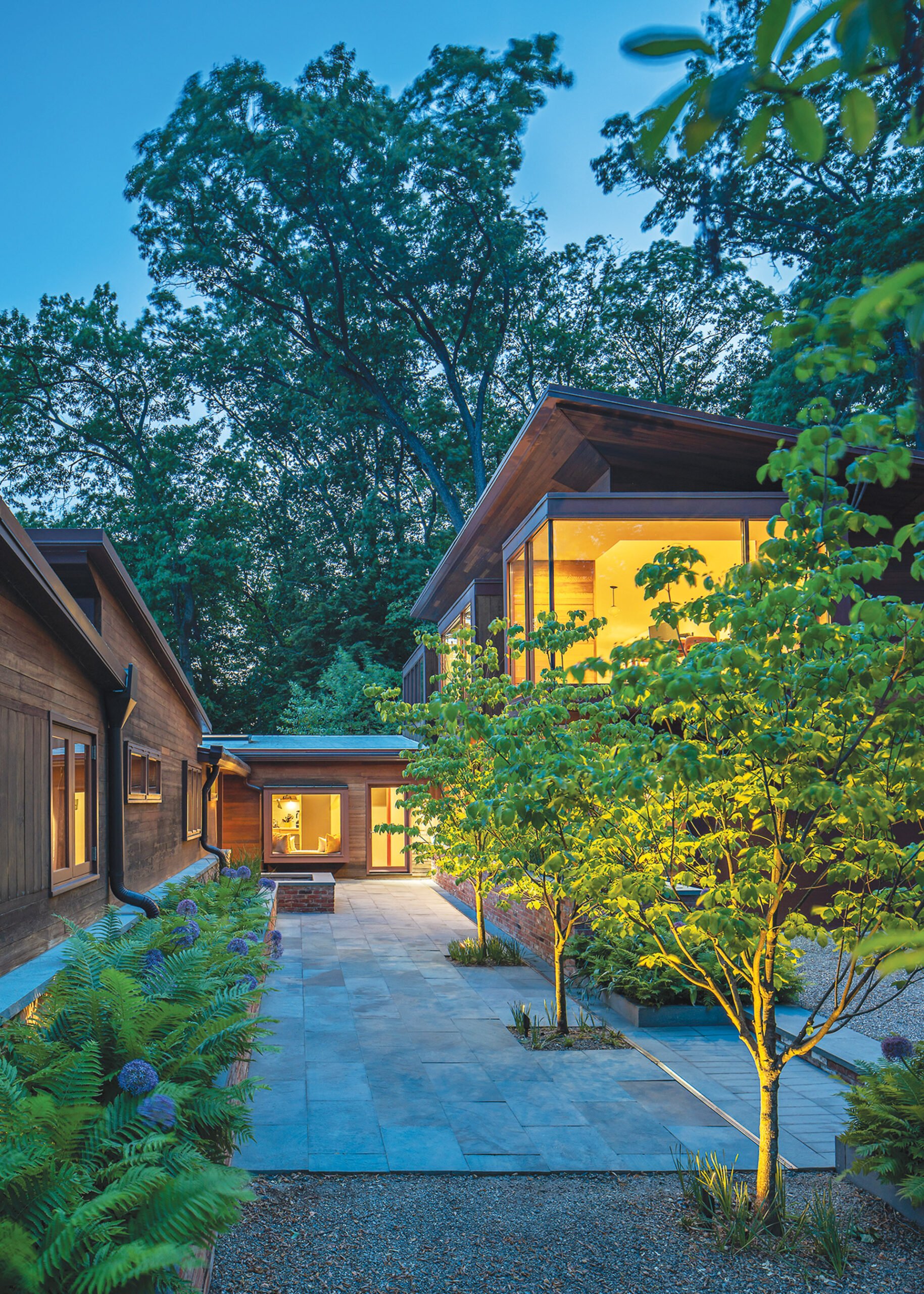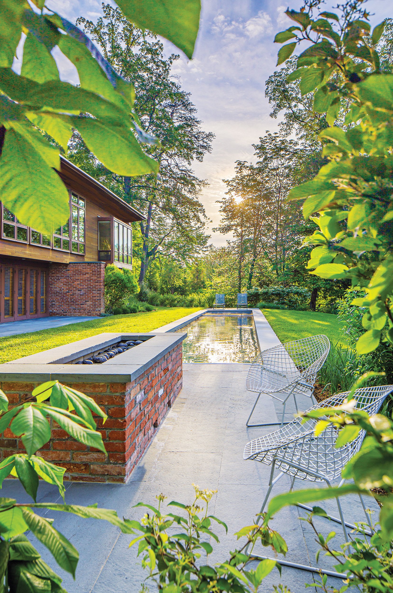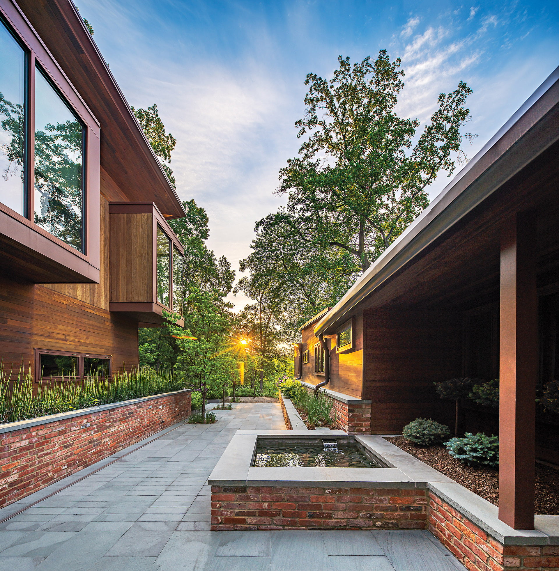 Horn notes that clients with mid-century houses often imagine West Coast landscapes, with concrete pavers and gardens offering year-round interest. “Translating that to the cold, snowy Virginia winters and hot, humid summers posed challenges,” she says. “We opted for thermal bluestone that can handle the freeze-thaw cycle a bit better.”